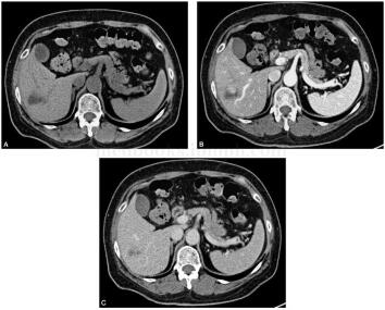 图2 CT增强扫描:考虑肝细胞腺瘤。CT平扫显示肝S5段稍低密度灶,边界模糊,增强扫描后动脉期呈结节样强化,门脉及静脉期结节强化减弱,低于周围肝实质