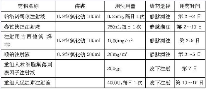 患者入院第7天血常规示:白细胞计数3.0×109/L,给予人粒细胞集落刺激因子300μg皮下注射。第9天复查血常规示:白细胞计数10.7×109/L,红细胞计数2.84×1012/L,血红蛋白99g/L,血小板计数156×109/L,患者贫血较明显,给予重组人促红素皮下注射治疗。