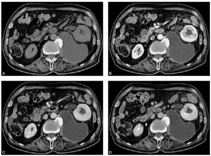本病临床表现无特异性,患者常以腹部酸胀、疼痛或肿块为主诉,部分可有血尿、肿块可于外伤后1~2个月甚至数年后发现,压迫迷走神经时可出现腹胀、消化不良等症状,由于本病缺乏特异症状、体征,易被忽视。