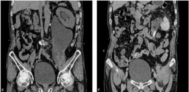图1 左肾后方见不规则囊性密度病灶,壁薄,其内呈液体密度,囊壁明显强化,内部未见强化,左肾后间隙延伸至髂腰肌下缘水平,其前上缘局部可见尖角状改变,与相邻左输尿管关系密切,邻近腰大肌受压萎缩,左髂肌受压。右输尿管未见异常。F图示左输尿管上段内见类椭圆形高密度结石影,其近端输尿管及左肾盂轻度扩张,左肾增大前移,肾周脂肪间隙见少许渗出絮状影