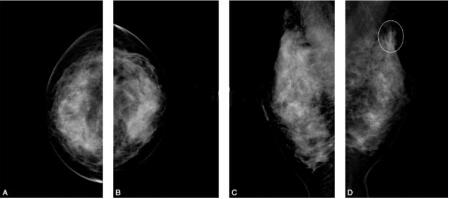图1 双乳轴、斜位像:双侧乳腺多腺体型,乳体内散在分布斑片状腺体及脂肪岛。对比右侧乳腺,左乳外上象限结构扭曲(圆圈所示),乳体内未见肿块及异常钙化征象。腋下未见肿大淋巴结。皮肤未见明显增厚,乳头未见凹陷
