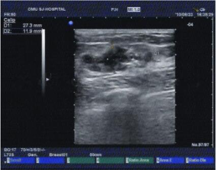 女性患者,34岁。6个月前无意中发现左乳腺肿物,鸡蛋黄大小,局部皮肤无红肿,轻微疼痛,半年来自觉无明显增大。查体双乳对称,未见橘皮征及酒窝征,乳头无凹陷。左乳外上象限距乳头3cm处可触及2cm×2cm肿物,质硬,边界欠清,活动度可,与皮肤及胸肌无粘连,无明显压痛,乳头挤压无溢液,腋下未触及肿大淋巴结(图1~图3)。
