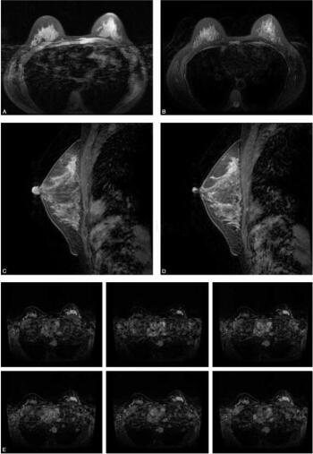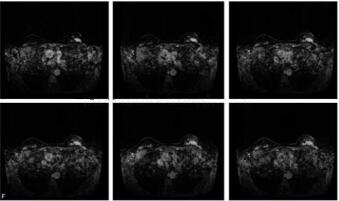 乳腺癌在T1WI上层低信号,T2WI上呈高信号,边缘模糊不清,可见毛刺或呈放射状改变,亦可肿块不明显而仅表现为病变局部信号异常或结构扭曲,对病变内部微细钙化显示欠佳。多期动态增强扫描及数字剪影技术的使用,使乳腺癌得以清楚显示,亦表现为“快进快出”的强化曲线类型。