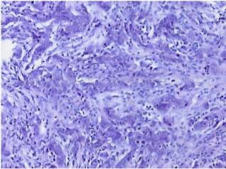 图4 病理图片:镜下见癌组织成巢,核分裂多见,未见脉管内癌栓形成,诊断为浸润性导管癌(Ⅱ级)