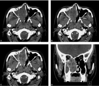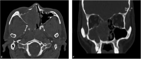 图1 鼻窦CT平扫、增强扫描及三维重组:图A、图B、图C为横断面平扫、增强早期及延迟期图像,图D为冠状面重建图像,图E、图F为横断面和冠状面骨窗。右鼻腔饱满,可见一软组织肿块影,内部密度相对均匀,边界清楚,形态欠规则,增强后可见不均匀中度强化;骨窗示周边未见明显骨质破坏,鼻中隔及右上颌窦内侧壁可见变薄、吸收及弧形移位