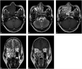 图2 鼻窦MR平扫及增强扫描:图A、图B、图C为横断面T1WI、T2WI及增强扫描,图D、图E为冠状面T2WI及T1WI增强扫描,可见右侧鼻腔内占位病变,形态不规则,内部信号混杂,增强后可见不均匀中度强化。右上颌窦及蝶窦可见黏膜增厚,呈长T1、长T2信号影,增强后可见线状环形强化
