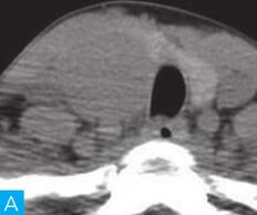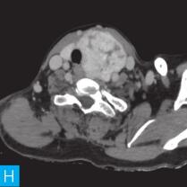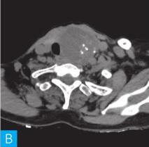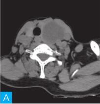 女性,57岁。于30年前在无明显诱因下发现颈部有一鸡蛋大小包块,质软,无特殊不适,未就诊,但近3年来肿块逐渐增大,呈鹅蛋大小,且质地变硬。自发病以来无明显消瘦,无胸闷、气短,无声嘶,无发热,无咳嗽咳痰,大小便无异常。