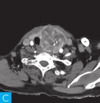 57岁女性,于30年前在无明显诱因下发现颈部有一鸡蛋大小包块,质软,未就诊。近3年来肿块逐渐增大,呈鹅蛋大小,且质地变硬。经影像学检查,发现该患者患有……