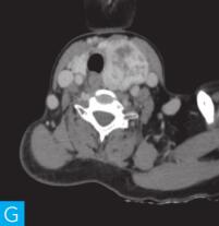 甲状腺最常见的恶性肿瘤,CT常表现为形态不规则、咬饼征、增强后范围缩小/模糊和微钙化,易出现颈部淋巴结转移(图4)。
