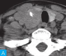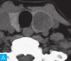 图2 滤泡性腺瘤:A.颈部CT横断面;B.颈部CT横断面增强