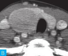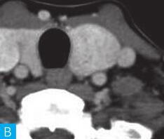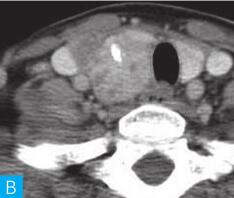 多见于桥本甲状腺炎病人,短期内肿块迅速增大,CT平扫及增强密度多较均匀,强化程度呈轻中度,周围血管呈包绕而非推移样表现,较大瘤体常向气管食管沟延伸(见图1)。