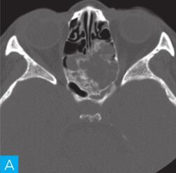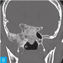 本病例定位不难,病变主体位于双侧后组筛窦区域。病变区呈轻度膨胀性骨质破坏,内部以软组织密度成分为主,正常筛窦的骨性间隔破坏消失,边缘骨质硬化,提示病变进展速度相对缓慢,对于病变的良恶性定性有一定价值,考虑病变为良性病变。