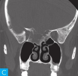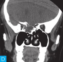 答案A 解析:结合CT横轴位及冠状位图像,该病变位于后组筛窦,不难判断。