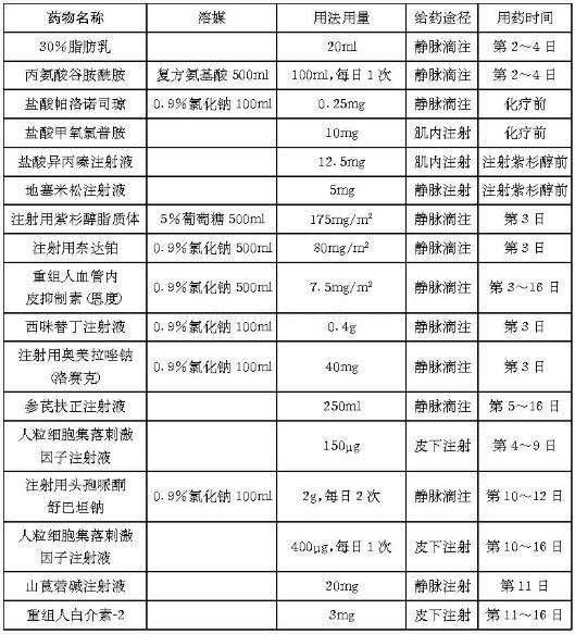 患者,女,76岁,身高160cm,体重42kg,体表面积1.42m2。患者自诉1年前出现吞咽困难,就诊于医院,行胃镜及活检病理诊断为食管癌,当月在全麻下行食管癌根治术,术后病理(食管)鳞状细胞癌Ⅰ‐Ⅱ级。术后1个月按“奈达铂120mg d1+氟尿嘧啶0.75g d1~3”方案化疗,10个月前开始放疗,9个月前按原方案行辅助化疗3周期。复查CT示:两肺多发斑片影,考虑感染性病变;纵隔肿大淋巴结、双侧胸腔积液;食管癌术后,未见其余特殊。1个月前中旬出现轻度声嘶,大量饮水时可出现呛咳,无咳痰,无胸闷、憋气,无畏寒、发热。为进一步治疗入院。自发病以来,患者睡眠、精神、饮食稍差,大小便正常,体重无明显下降。