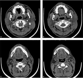 图1 双侧腮腺CT平扫:图A、图B可见双侧腮腺弥漫性增大,密度不均匀增高,边界欠清,局部皮下组织、皮下脂肪消失,邻近皮肤增厚;图C、图D示双侧腮腺周围、颌下周围和颈深部可见多发淋巴结增大,增大的淋巴结密度均匀,边界清楚光滑,无坏死及囊变,几乎不融合
