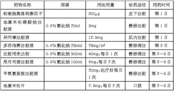 ①在使用多西他赛治疗前1天,嘱患者口服地塞米松(每片0.75mg)10片,每12小时1次,饭后服用,连续服用4~5天;②多西他赛应在2~8℃条件下保存;③奈达铂化疗时,药师交代患者一定要大量饮水,用药期间忌接触和服用凉冷物品;④出院后每周做1~2次血常规,如果白细胞计数低于4.0×109/L时,给予皮下注射人粒细胞集落刺激因子150μg,每日2次,当血常规示白细胞计数高于10.0×109/L时可停止注射。