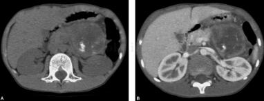 为儿童常见恶性肿瘤,肿块既侵袭肾实质,亦向外生长形成肿块,常有假包膜,出血、坏死、囊性变较常见,坏死区域及周边被覆区可见钙化灶。于肿块周边部见残存的肾皮质,增强扫描密度显著增高,与肿瘤形成鲜明的对比,且有包绕肿块征象,则提示肿块来源于肾脏,可与胰母细胞瘤相鉴别。