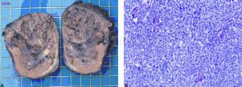 胰母细胞瘤最终确诊依靠病理学检查。胰母细胞瘤的组织形态学特征与人胚胎第8周的胰腺组织相似,目前认为其有2种亚型,一种由腹侧胰腺原基分化而来,位于胰头部,边界完整,预后较好;另一种由背侧胰腺原基分化而来,位于胰尾,边界不清,预后较差。胰母细胞瘤镜下表现为巢团状或者腺管状分布的特征性腺上皮细胞,常有出血和坏死。上皮成分为比较一致的多角形细胞,形成巢状、片状或腺泡状结构,少部分病例还可以有局灶性腺管形成,腺腔内有少许PAS阳性物质,由梭形细胞巢构成的“鳞状小体”是胰母细胞瘤的特异性组织病理特征之一,核分裂象少见。间叶成分包括疏松排列的梭形细胞、纤维血管间质、骨样组织、软骨样组织等。大多数肿瘤由成熟的纤维组织包绕,偶有肿瘤侵及邻近组织和器官。