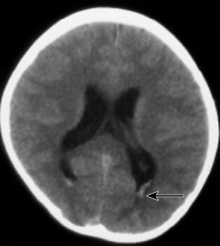 图1 首次颅脑CT检查(外院,2010年10月20日):脑室系统饱满,双侧脑室后角室管膜下血管影显著(箭头),余颅脑平扫未见异常