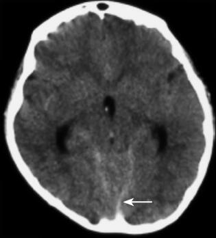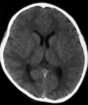 患儿,女,10岁,因“3个月内抽搐2次”于2010年10月23日入本院儿内科。患儿于入院前3个月(2010年7月21日),无明显诱因出现头痛,头痛后出现抽搐,抽搐表现为意识丧失、双眼紧闭、头后仰、全身僵直、双手握拳屈曲、小便失禁,持续约1~2分钟后自行缓解,缓解后意识清楚、全身发软,伴呕吐数次,为非喷射性,呕吐物为胃内容物,发病1天后出现头痛、腰背部疼痛,不伴有发热、腹泻。就诊于当地医院,查颅脑MRI及MRA未见明显异常,行腰椎穿刺术未成功,给予地塞米松及其他药物(具体不详)治疗后好转,未再出现抽搐及头痛。本次入院前3天(2010年10月20日)患儿诉咽痛,无发热、呕吐、腹泻,自服小儿氨酚烷胺颗粒治疗,于当日夜间再次出现抽搐,表现同前,抽搐后亦出现头痛、呕吐及颈项强直,就诊于某市级儿童医院,查颅脑CT检查(图1),显示“脑室系统饱满,双侧脑室后角室管膜下血管影显著,余颅脑平扫未见异常”;血常规、血生化及血气分析检查均未见明显异常。给予头孢甲肟、甘露醇、布洛芬等治疗,仍有间断头痛,为求进一步诊治就诊于本院,门诊以“抽搐原因待查”收入院。