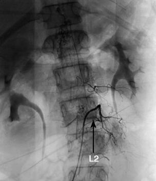 图4 全脑全脊髓血管造影(2010年10月29日)提示:T11~L2硬脊膜动静脉瘘(箭头)