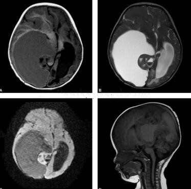 室管膜母细胞瘤(ependymoblastoma)是一种罕见的恶性胚胎性脑肿瘤,好发于新生儿和幼儿。室管膜母细胞瘤过去名称繁多,较为混乱,直到1990年世界卫生组织分类才将其归类于胚胎性肿瘤范围。室管膜母细胞瘤是一种多发生于年龄较小婴幼儿的罕见的神经上皮肿瘤,5岁以下多见。室管膜母细胞瘤因其发生于颅内,由于肿块压迫,或者脑室内肿块的阻塞,引起脑积水,致继发性颅内压增高。患儿临床表现常为癫痫样发作,或是局部运动障碍。室管膜母细胞瘤多呈结节状或分叶状,大多与周围脑组织分界清楚。表面多呈灰色、质嫩、脆,体积较大肿瘤可发生出血坏死和囊性变。