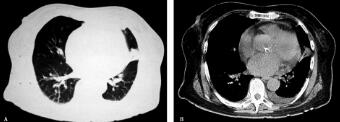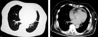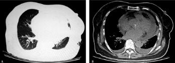 10.胸部CT(2012年6月20日):两肺支气管血管纹理束增多、紊乱;左肺上叶多发斑片状渗出影及索条影,左侧胸腔见条带形液性密度影;心脏影增大,心包少量积液(图1A肺窗、B纵隔窗)。