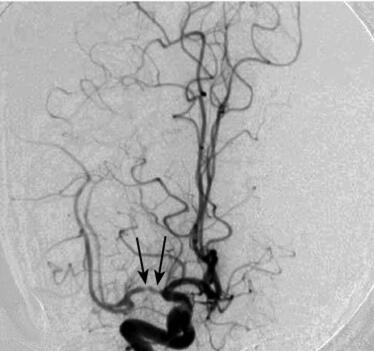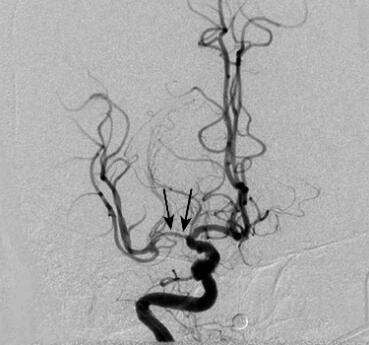 图2 大脑中动脉球囊扩张术后DSA结果:右侧大脑中动脉狭窄部位有所扩张(箭头)