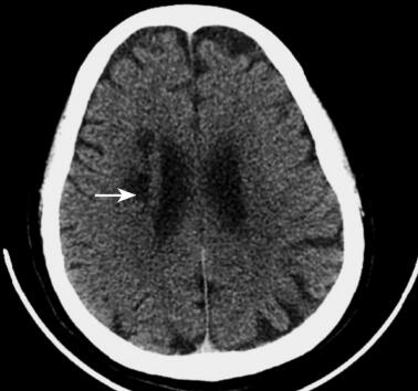 图3 CT结果:右侧放射冠低密度脑梗死灶(箭头)
