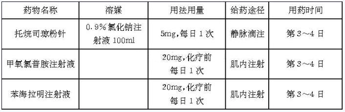 药学监护与患者教育:托烷司琼、苯海拉明、甲氧氯普胺和地塞米松的使用,可预防和治疗化疗所引起的呕吐和过敏反应症状。药师提出,患者化疗期间不得进食冰冷食物或用冰水漱口,以免因低温激发外周感觉神经病变,如引发喉痉挛等。密切观察患者用药后有无咽喉发痒、咳嗽、胸闷、气短、全身皮肤潮红等过敏反应,必要时及时采取措施治疗。若患者突然出现腹泻、口炎、溃疡或出血,应立即停药,直至这些症状完全消失。当出现心功能不全或心绞痛、ST段改变等心血管反应时也应立即停药,以防猝死。治疗前及治疗过程中应每周检查血常规,若出现血液毒性,应推迟下周期用药,直至恢复。