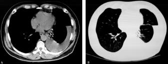 1.胸部CT(2011年12月19日引流900ml胸腔积液后):左侧胸腔积液伴左肺下叶膨胀不全,左侧叶间积液,纵隔及左肺门增大淋巴结,心包少量积液(图1A纵隔窗、B肺窗)。