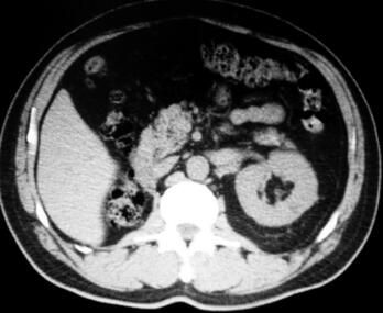 2.全腹CT(2011年12月28日):左肾可见一类圆形低密度影,直径约0.8cm,其内CT值为15HU,扫描范围内右肾未见显示,其他肝脏、脾脏、胆囊、胰腺、膀胱、前列腺均正常,腹膜后及盆腔未见增大淋巴结。诊断建议:左肾小囊肿,右肾缺如,术后改变(图2)。