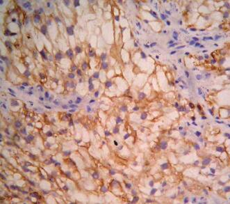 充分引流胸腔积液致左肺组织大部分复张,再次阅读胸部CT:左肺组织内未见异常病变,但左侧少许胸腔积液内靠近后胸壁处似见一局部密度增高影,呈梭形,故考虑有可能为胸腔积液原因。遂于2011年12月30日行俯卧位胸部CT(图3A纵隔窗、B肺窗)示左后胸壁胸膜局部增厚,可见一软组织密度影,呈梭形,大小约4.5cm×1.9cm,CT值约为35HU。故取得此软组织的病理,有可能真相大白。与家属沟通后,行CT引导下胸膜活检术。病理回报:透明细胞癌,免疫组化(图4 HE×40):Vimentin(+),CK(+),CD10(+),CK5/6(-),CR(-),MC(-),TTF(-),CK7(-),CEA(-),透明细胞癌,考虑肾细胞癌转移来源。