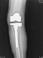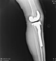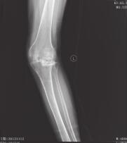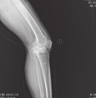 入院后完善各项检查,择期行左膝关节表面假体置换术,术中外侧平台骨质缺损较大,应用10mm垫片,加用胫骨延长柄(图3)。复查X线片(图4)示假体安装准确,左下肢力线良好,切口甲级愈合。术后1天指导患者行功能锻炼,逐渐下床负重行走,出院时左膝关节可屈曲110°。术后1年复查,左膝关节活动度0°~120°,稳定性良好,无疼痛不适,患者自我评价良好。