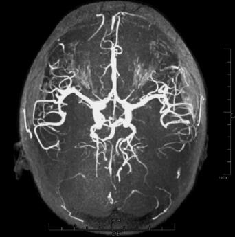 图2 2011年4月27日行头颅MRA检查,右侧大脑后动脉起自颈内动脉,未见颅内血管狭窄、硬化等异常征象