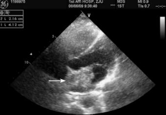 图3 2011年4月27日行超声心动图检查,示左房房间隔水平见一大小约21.6mm×41.0mm中等回声团(箭头),提示黏液瘤可能