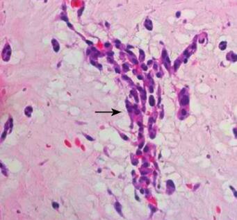 图4 心脏术后(2011年5月6日)左房切除瘤体的苏木精-伊红染色法(hematoxylineosin staining,HE)染色,可见特征性的酸性黏多糖基质和嵌于其中的多角形细胞(箭头)(×400)