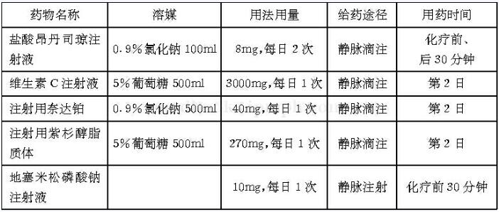 (2)患者教育:奈达铂化疗前一日,交代患者一定要大量饮水,超过2L;应对患者进行健康教育,使其出院后对定期复查血象和自我监测的必要性有足够的认识,如有特殊不适应随诊;应提醒患者对脱发现象有心理准备,停止化疗后一般可再生新发,因此告诉患者必要时可戴假发度过化疗期。