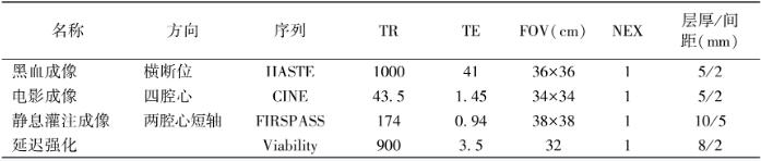 磁共振成像检查:应用1.5T场强的MRI仪(Magnetom Sonata,Siemens),患者取仰卧位,头先进,32通道心脏表面线圈,心电门控,采用黑血序列进行横断位平扫,然后行四腔心、两腔心长横断位及两腔心短横断位电影序列扫描。静息灌注序列采用两腔心短横断位及四腔心平面,采用钆喷酸葡胺对比剂,按0.2mmol/kg体重注射。灌注对比剂流率为5ml/s,总量8ml。延迟增强扫描于首次心肌灌注后立即以2ml/s的流率注射总量14ml的对比剂,于8~10分钟进行延迟扫描。心脏MRI检查方案见表1。影像学检查见图1。