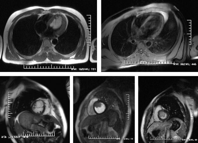 MRI表现:心内结构未见明显异常,各房室未见明显增大;HASTE见左室内占位,与室间隔相连,为均匀高信号,压脂后信号减低;心脏电影显示各节段运动正常,各瓣膜收缩舒张未见明显异常,未见返流信号;心肌静息灌注显像见左室内充盈缺损,心肌未见明显异常灌注,心肌延迟强化序列显示心肌内未见明显异常强化灶,病灶未见明显强化。