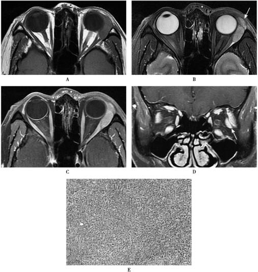 病变位于肌锥外间隙,T1WI和T2WI呈均匀等信号,增强扫描轻度均匀强化,泪腺和眼外肌未见受累。