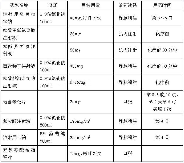 (1)紫杉醇给药期间,应注意有无过敏反应及生命特征的变化。用药后最初的10分钟,应密切观察支气管痉挛性呼吸困难、荨麻疹和低血压。输注药物过程中注意静脉和药物外渗引起的炎症。为了预防发生过敏反应,在紫杉醇治疗前12小时和6小时均分别口服地塞米松20mg,治疗疗前20~60分钟肌内注射或口服苯海拉明50mg,静脉注射西咪替丁300mg或雷尼替丁50mg。