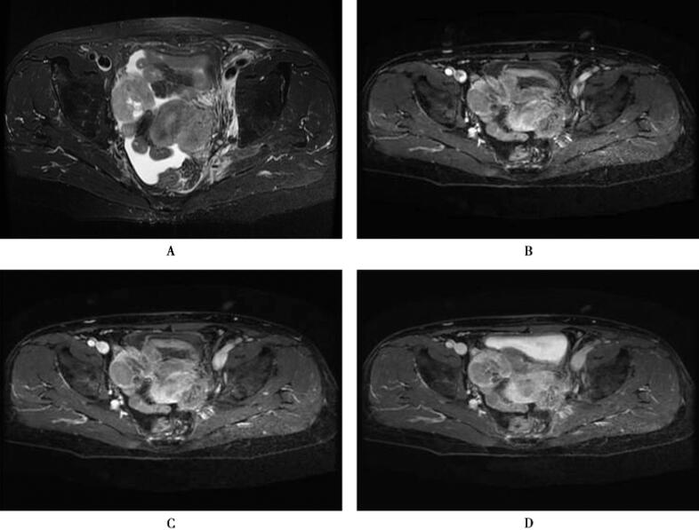 T1WI(A)显示双侧附件等信号肿块,T2WI(B)肿块呈稍高信号,增强扫描(C,D)肿块不均匀强化