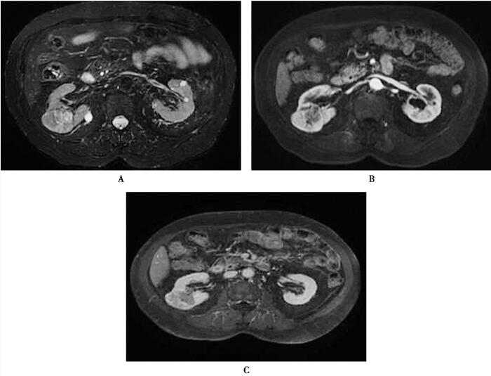 在体轴横断位T2WI+FS图像上(A),显示右肾肿块稍高信号,其内部可见点片状更高信号,肿块由低信号包围,增强扫描动脉期(B)肿块显著不均匀强化,延迟期增强扫描图像(C)上肿块呈低信号,提示对比剂快速流出