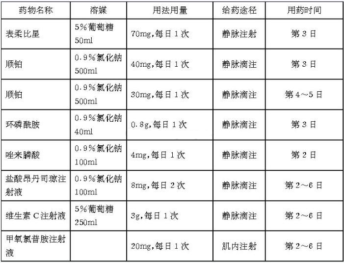重点监护表柔比星所致心肌毒性、顺铂所致肾毒性、环磷酰胺所致出血性膀胱炎、化疗药物所致骨髓抑制作用。