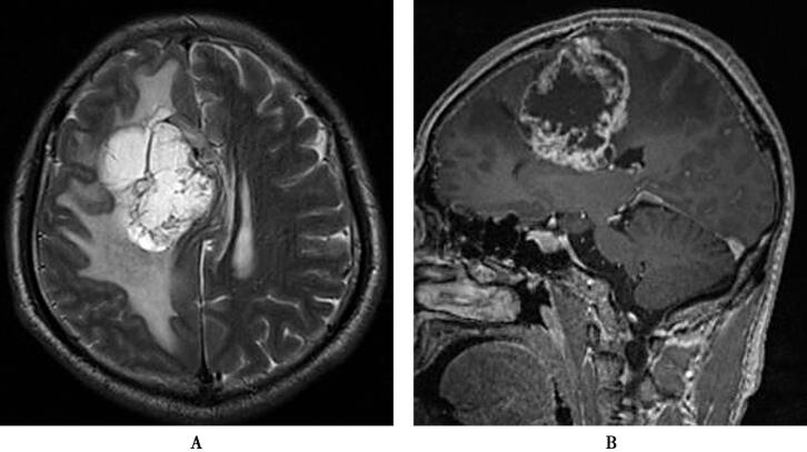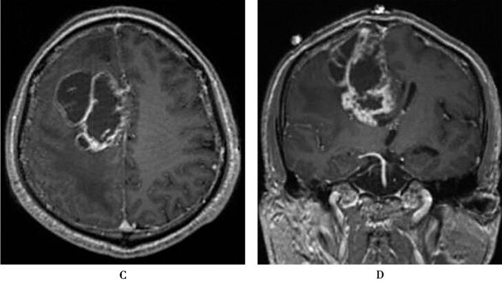 右侧额叶形状不规则的异常信号灶,占位效应明显,周围脑组织广泛水肿,增强后病灶呈“花环样”不均匀强化,周围水肿区域无明显强化