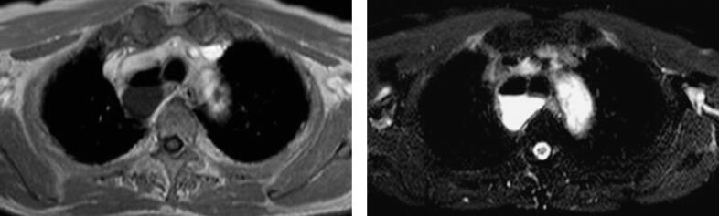 MRI对于含水量高的囊性病变显示效果极佳。支气管源性囊肿是指先天性的呼吸系统发育异常所引起的一种囊性肿物,又称支气管囊肿。按发病部位分为肺内型、纵隔型和异位型。囊肿较小时,可无任何临床表现;当囊肿增大或合并感染时,可对周围组织产生压迫症状或出现感染症状。