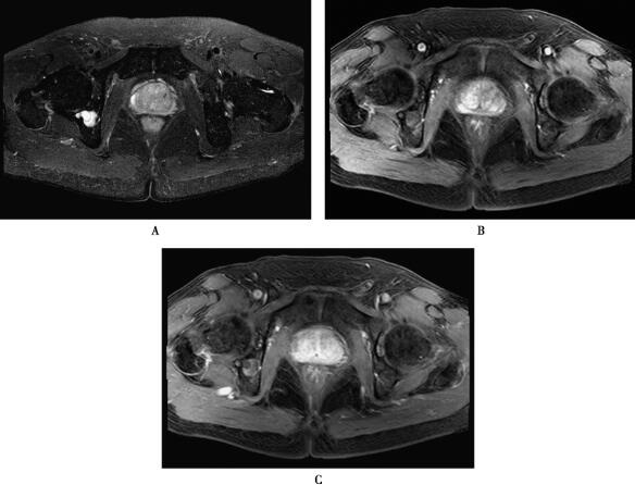 T2WI(A)发现前列腺右侧外周带的片状低信号,增强扫描动脉期(B)病灶显著强化,静脉期强化(C)程度有所降低