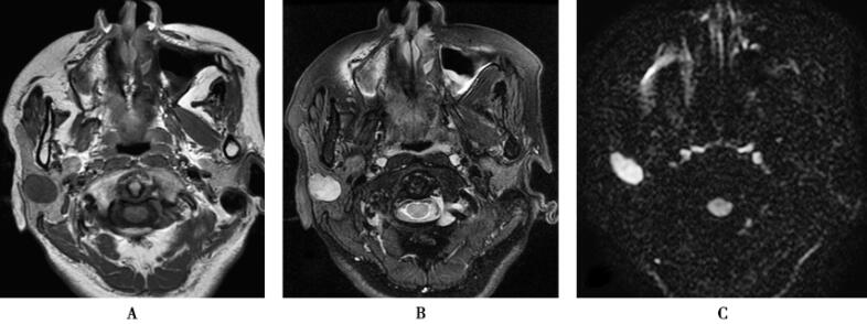 1.右侧腮腺多形性腺瘤右侧腮腺浅叶上部见椭圆形病灶,边界清晰,见浅分叶,病灶内部信号欠均匀,T1WI呈稍低信号,T2WI呈高信号,信号不均匀,DWI呈高信号,增强扫描病灶延迟性强化,强化欠均匀,TIC曲线呈持续强化型。