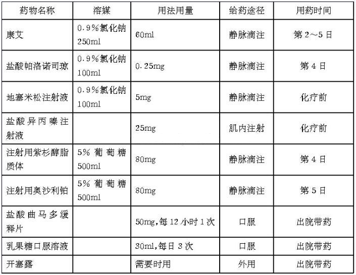 患者,男,60岁,身高178cm,体重67kg,体表面积1.85m2。2个月前以持续性骶骨尾部疼痛起病,伴有尿频、夜尿增多。在当地医院行泌尿系B超示前列腺增生钙化。行对症治疗,效果不理想。后患者骶尾部疼痛逐渐加重,伴有大便干结,左脚水肿,患者于1个月前来院就诊,行泌尿系B超示:右肾囊肿,前列腺增生钙化,膀胱内异常回声,性质待定。膀胱镜示:前列腺增生,膀胱新生物,病理示:膀胱三角副神经节瘤不能除外,建议免疫组化进一步检查。肿瘤标志物:总前列特异抗原64ng/ml,游离前列腺特异抗原14.5ng/ml。盆腔MRI+MRS示:前列腺异常信号影,波谱倒置,考虑前列腺癌并精囊浸润。门诊前列腺肿块穿刺活检病理示:前列腺癌。左侧腹股沟区淋巴结穿刺细胞学见:恶性肿瘤细胞。前列腺癌诊断明确后,开始按“紫杉醇脂质体120mg d1、8,奥沙利铂100mg d2、8”行全身化疗,过程顺利。今入院行下一周期化疗。目前患者骶尾部疼痛,精神尚可,食欲一般,睡眠稍差,尿频,夜尿增多,大便干结、便秘,体重无明显减轻。